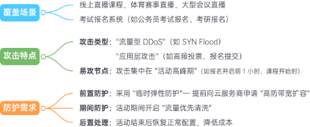 部分场景仅在 "特定时间段" 面临高 DDoS 风险,需 "临时强化防护",核心需求是 "快速部署、弹性抗攻击"。